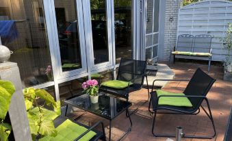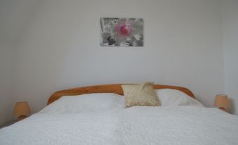 The flat is well appointed, the bed comfortable, everything you need is supplied, the hosts are very friendly and helpful. It was hot and I was able to sit in the shade in the garden. There is a short walk to the metro station and supermarket. It would also suit a couple with primary age kids. There is a room in the basement with further beds, next to the bathroom, accessible though a spiral staircase.