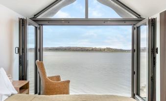 A spacious open-plan living space provides panoramic views of the Lake District to be enjoyed from soft and comfy sofas, a modern well-equipped kitchen or dining table. All in sleek, Scandi finish welcoming tranquillity. Large retractable doors open up onto a well sized balcony with a 180 degree view of the Estuary, perfect for taking in the scenery whatever the time of day or year. Patio loungers available for a perfect, relaxing time on the balcony.
