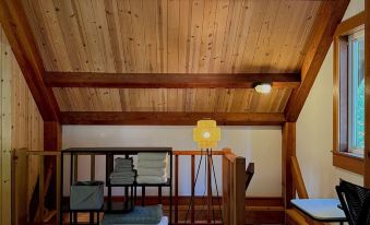 The ground floor is an open floor plan offering a full kitchen, living room lounge area, dining area, a laundry room, and access to multiple outdoor spaces. The spacious second floor with vaulted wood ceilings offers a king bed, a full-size leather sofa for lounging, an office area, and a full bathroom.