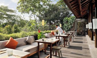 The restaurant is called Kemiri. The open air space seating 70 in addition to an intimate private dining room - stylish area beside a waterfall-fed pond - with light airy alang-alang ceilings. Kemiri serves breakfast - lunch and dinner. All Day Dining is also available