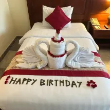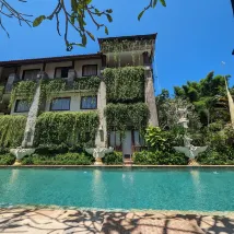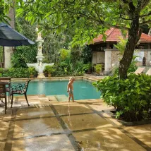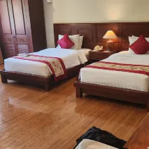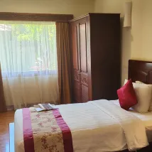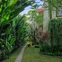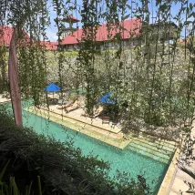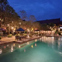The hotel stands out among other hotels for its pool area. Despite the fact that the pools (2) are small, they are very beautiful and relaxing. Extraordinary greenery, flowers, trees, many fountains (the murmur of water). After half an hour in the pool, you feel a sense of relaxation and peace from such murmur and beauty. Comfortable beds, a green balcony in the room, a wonderful breakfast by the pool. I didn't like the location. The street is not very developed, despite the fact that it is central, a small selection of restaurants. Eternal traffic and honking. The beach is a 25-30 minute walk along ugly streets. The shuttle runs rarely. I liked the beach from the hotel. It is located far from the others (at the end of the beach), in the greenery. But I didn't like the sea in Nusa Dua. During our stay, there were strong waves and a lot of garbage in the water, eternal low tides... We took a dip once, didn't want to anymore, and spent the rest of the time in the pool. There is nothing to do in Nusa Dua for more than 2-3 nights. I liked Kuta more (there are big good hotels, and developed infrastructure, and I liked the beach more). Next to the hotel (to the left) there is an exchange office with a good rate, they accept old dollars, but they almost took away our exchanged money when we left. They work in pairs, be careful. There were three of us, so we managed to leave.