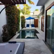 Amazing stay (one bedroom villa with private pool). The villa is roomy, clean and very well equipped (including smart TV). The outdoors is picturesque with a fabulous pool that got a lot of use! Outdoor bathroom but in this climate - that works. Not that we cooked whilst we were there but we could have if we wished! There were ample pots/pans and cooking utensils and crockery/cutlery/glassware enough for four people so you could easily invite friends over. There was even an esky that made lazy pool days even more enjoyable. Bottled water was provided in a unit that both heated and chilled water. Location is fabulous - less than 10 mins walk to Eat Street yet far away enough from that hustle and bustle that the stay was quiet. Within a few steps there was a Circle K convenience store, wash and fold and local massage store. A few more steps up the road - cafe, pizza bar and fresh juice bar. Location Location! The staff are also fabulous. We highly recommend Kamil Villas. You can’t go wrong :-)