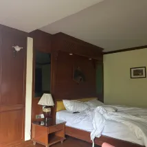 I often stay at this hotel because it's in a good location. It's not far from the Nana BTS station and is quiet. The room is spacious, and at this price point in Bangkok, you won't find this kind of space. The furnishings are a little dated but still functional. There's a large refrigerator and microwave. On the downside, the sheets are stained and the door doesn't close properly.