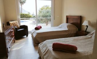 There are three double bedrooms and two twin bedrooms each with quality beds, dressing tables and wardrobes. Each bedroom has an en-suite bathroom or shower room, ceiling fan and double doors to the terrace and paved garden.