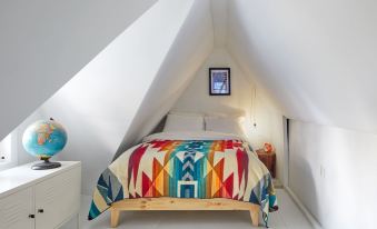 This cabin has two bedrooms, one upstairs and one downstairs. The primary bedroom downstairs has a queen-sized bed, beautiful views of woods and stars, beautiful light and artwork. The full bed upstairs is super cozy and open to all the quiet reading nooks in the A-frame space. It feels really special and from another era, where everything was handmade. The bathroom is located downstairs on the first floor, and is modern and beautiful, with a full bathtub for soaking.