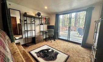 DK’s Treehouse is a thoughtfully designed hideaway backing directly onto forest trails. A place where every detail feels intentional, every corner whispers “cozy,” and every guest feels at home. It features an elevated king bed, a fireplace, and a fully stocked kitchen with all new appliances. Work remotely with two ergonomic sit-stand desks and fast WiFi (300mbps). Two spacious patios immerse you in nature, while dimmable lighting and surround sound speakers allow you to create your own vibe.