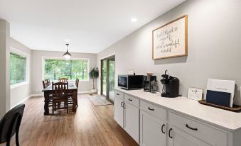 Best outfitted kitchen for pots and pans, utensils, table settings, spices and basic condiments. Wonderful to have 4 king beds plus a queen. The house was clean. The backyard is a park setting with a stream and lots of ducks. The kitchen and bathrooms are updated and very nice. My one suggestion would be to sweep out the garage.