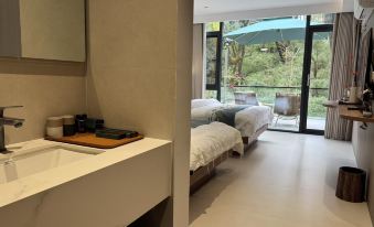 一開始被4.0的評分嚇到,看着圖片又比較温馨,最後還是定了。結果出乎意料的好!房間佈置特別大氣,地磚都是大塊兒的!智能馬桶、淋浴間乾淨、空調給力!最最舒服的是陽台!!!躺着就能看見山林。老闆一家也很親切!!!總之特別特別滿意!