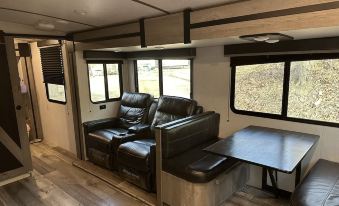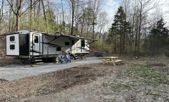 Relax and rejuvenate with a luxurious glamping experience in the woods. Off the beaten trail - Enjoy your own private hot tub spa, beautiful lake-view, deluxe RV travel trailer, and amazing site for star gazing.