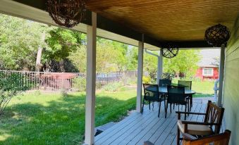 It's a mid-century-inspired lofted space with a kitchenette, fireplace, cable tv, and dining area, perfect for two couples or a family of four. There is a one-bedroom master and en suite and a queen size sofa bed. A luxurious saltwater hot tub is available year-round. A beautiful fenced saltwater pool is open from Memorial Day Weekend to Sept 30th! There is a fire pit in the garden, too.