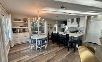 The fully-equipped kitchen and Traeger grill make meal preparation a breeze, whether you're cooking for the family or enjoying a romantic dinner for two. You can savor your meals at the dining table with a view of the lake or relax on the private dock while watching the sunset with a cup of coffee or tea from the coffee bar.