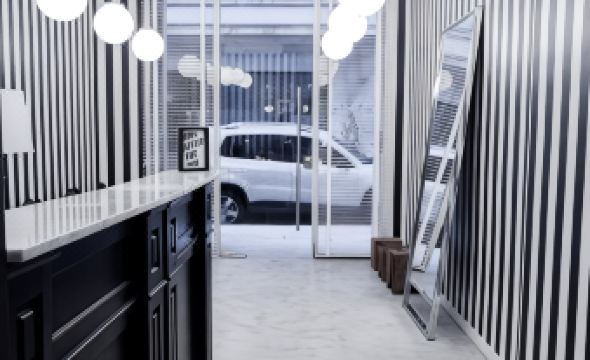 Also the monochrome design is modern and attractive but the white lighting makes the room feel harsh on the eyes. Warm lighting would do wonders for the space.