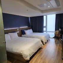 The location is excellent. Supermarkets, a food street, and cosmetic shops are all conveniently located just downstairs. The beach, with its soft, fine sand, is also right across the road, and enjoying the sea breeze in the evenings was very pleasant. Please note that check-in is on the 4th floor; you'll need to take an elevator from the ground floor up to the 4th, then switch to another elevator to reach your room's floor. The hotel does not provide toothpaste or toothbrushes. The room is quite spacious, featuring two large (1.8m) beds, and there's enough space to easily open luggage for four people. It also includes a refrigerator, and four complimentary bottles of water are provided daily. Highly recommended!