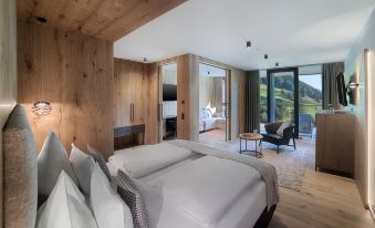 Abbiamo soggiornato una settimana in questo hotel e l’esperienza è stata nel complesso positiva, con alcuni aspetti però da migliorare. La posizione è eccellente, fronte piste per l'inverno e bellissimi percorsi trekking per l'estate dai più semplici a quelli molto impegnativi. La camera era molto bella: interamente arredata in legno, con un piccolo salottino e una splendida vista sulle montagne. Un ambiente davvero indimenticabile. I servizi sono efficienti: ogni richiesta è stata accolta in pochi minuti, anche il servizio in camera. La colazione e il pranzo a buffet offrono un’ampia varietà e risultano completi e soddisfacenti. Il buffet della cena, invece, non sempre è all’altezza di un 5 stelle, sebbene l’offerta alla carta si sia rivelata valida. Molto apprezzata la saletta dedicata ai formaggi locali e la cantina dei vini, con una selezione eccellente di etichette sia regionali che nazionali e un servizio adeguato. La spa, condivisa con l’hotel adiacente, è uno dei punti forti: ampia, ben organizzata e dotata di zone relax, saune e piscine. Il personale si è dimostrato cortese e preparato. Un aspetto da sottolineare è che si tratta di un family hotel. L’unica area adults only è la spa, mentre negli altri spazi (ristorante, bar, aree comuni) i bambini hanno piena libertà. Questo significa che chi cerca tranquillità e relax potrebbe trovare l’ambiente un po’ caotico, soprattutto durante i pasti e la sera al bar, spesso animato come un prolungamento del miniclub. Il ristornate, in particolar modo, affollato con bambini che giocano tra i corridoi. Pur essendoci varie sale che potrebbero essere dedicate in forma esclusiva agli adulti, l'aspetto non viene considerato. Nota meno positiva il late checkout: non ci è stato concesso poiché la camera era già riservata per la sera stessa. L’hotel ci ha offerto la possibilità di restare in spa durante la giornata, ma con un supplemento di 45 € cadauno. Considerando il livello e il costo della struttura, sarebbe stato più appropriato offrire l’accesso gratuito, come accade in molti hotel simili. Un consiglio pratico: è bene leggere con attenzione le mail informative prima del viaggio. All’arrivo in reception, infatti, non ci sono state fornite molte spiegazioni. Solo dopo abbiamo scoperto l’esistenza di un pass gratuito per i trasporti pubblici e le funivie, riservato agli ospiti, che purtroppo abbiamo utilizzato troppo tardi.