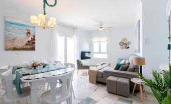 Upon entering the apartment we find on the left the main room with a 1.50 x 1.90 bed, built-in wardrobe, large window with sea views and a complete bathroom en suite. From the hall we access the fully equipped kitchen with all the necessary utensils for its use. Next, we have the living room with a dining table for six people, a beautiful sofa, Smart TV and access to the terrace equipped with a table and two chairs where you can enjoy the sea views.