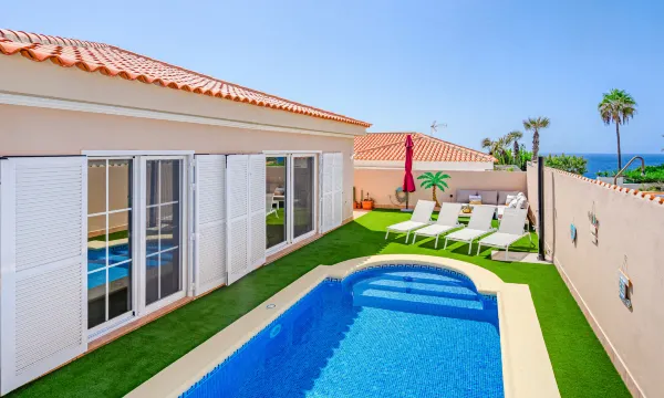Large, child friendly villa "Sueño Azul". In the resort Callao Salvaje, in a quiet, sunny position residential area (villas), traffic calmed area, 100 m from the sea, 600 m from the beach, in a cul-de-sac. Private: swimming pool angular, heated (depth 60 - 160 cm, seasonal availability: 01.Jan. - 31.Dec.) with internal staircase and shutter cover. Outdoor shower, pool maintenance by the owner/gardener. Supermarket 450 m, shopping centre 4 km, restaurant, café 50 m, bus stop "Callao Salvaje" 600 m, sandy beach "Playa de Ajabo" 650 m. Golf course (18 hole) 7 km. Nearby attractions: Siam Park 13 km, Teide 59 km, Masca 30 km, Aeropuerto Sur 27 km, Playa Las Americas 15 km. The owner does not accept any youth groups. Neighbourhood highly sensitive to noise. Quietness and good behaviour expected. "Mila Moon", 4-room villa 225 m2. Object suitable for 6 adults. Spacious and bright, comfortable and modern furnishings: living room with dining table, digital TV, international TV channels, flat screen and fan. Exit to the swimming pool. 1 room with 1 french bed (180 cm, length 200 cm), bath/bidet/WC and fan. Exit to the swimming pool. 1 room with 1 french bed (160 cm, length 200 cm), fan. 1 room with 2 beds (90 cm, length 200 cm), fan. Open kitchen (oven, dishwasher, 4 ceramic glass hob hotplates, toaster, kettle, microwave, freezer, electric coffee machine). Shower/WC. Boiler (80 litres). No heating option. Large terrace, lawn. Terrace furniture, barbecue, deck chairs (4), sitting area. Very beautiful panoramic view of the sea, the swimming pool and the countryside. Facilities: washing machine, mosquito net, children's high chair, baby cot for up to 2 year olds, hair dryer. Internet (WiFi, free). Please note: suitable for families. Non-smokers only. Smart TV. VV-38-4-0110592