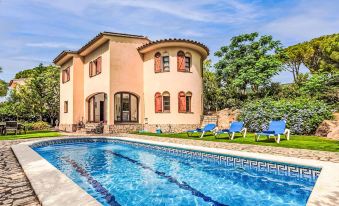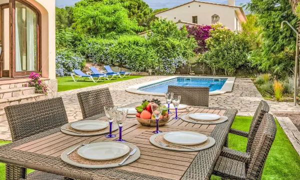 La Pineda 1 km from Calonge: House "Villa Brava". 4 km from the sea, 4 km from the beach. Private: garden (fenced) with lawn, swimming pool angular (8 x 4 m, depth 150 - 180 cm, seasonal availability: 01.May. - 30.Oct.) with internal staircase. Outdoor shower. In the house: central heating system. Parking at the house on the premises. Supermarket 1 km, restaurant 600 m, bus stop 250 m, sandy beach "Sant Antoni de Calonge" 4 km. Sports harbour 6 km, golf course (18 hole) 10 km, tennis 1 km, riding stable 3 km. Nearby attractions: Parque acuático Aquadiver 6 m. The owner does not accept any youth groups. "Villa Brava", 4-room house 211 m2 on 2 levels. Spacious and bright, practical furnishings: living/dining room with open-hearth fireplace, digital TV and international TV channels. Exit to the garden. 1 room with 1 french bed (150 cm, length 190 cm), bath/WC. 1 room with 1 french bed (150 cm, length 190 cm). 1 room with 2 beds (90 cm, length 190 cm). Kitchen (oven, dishwasher, 4 ceramic glass hob hotplates, toaster, kettle, microwave, electric coffee machine). Shower/WC. Gas heating. Solar power. Patio. Terrace furniture, deck chairs (4). Facilities: washing machine, iron, children's high chair, baby cot, hair dryer. Internet (WiFi, free). Please note: non-smoking house. TV only ES, FR, EN. HUTG-070335