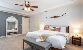 Welcome to the Carrollton Cowboy House. Take refuge in the private backyard to unwind, relax, and have fun. Try dipping into the iconic "cowboy pool" (stock tank pool) during the hot days, or lounge in the covered patio area. Sip a beer, indulge in some BBQ or play lawn games – there is a space for everyone.