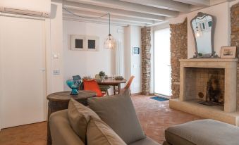 The kitchen is fully equipped with fridge, oven, coffee machine, mocha coffee maker, crockery and cooking utensils. The sitting area includes a large and comfortable sofa, a smart TV with wifi connection and a characteristic, but not working, fireplace.