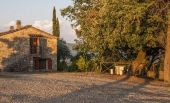 It can be accessed by climbing the external stairs of the main building. The entrance leads to a very spacious hall, divided into two areas by a brick arch: the first, in front of a beautiful fireplace, with table and chairs, the second, furnished with sofas and armchair and a TV 32 '. To the right is the large and fully equipped kitchen with table and chairs. The apartment also has three double bedrooms and two bathrooms: one, smaller, with a bathtub, and one, larger with a shower. At the entrance, a small terrace / veranda with table and chairs, where you can enjoy a quiet breakfast and unforgettable dinners. From here you can enjoy a beautiful view of the valley and Pari, as well as, in the background, Mount Amiata.