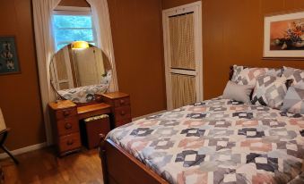 It’s cottagey with updates to the bathroom and kitchen. I liked the clean bathroom and equipped kitchen. Living area was comfortable with a nice tv. Very close to town.