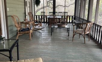 Brand new appliances in the kitchen, a great dining room, a large living room, and a huge screened-in porch, sit just above the Guadalupe River. Two separate, comfortable bedrooms, each with a queen bed, are decorated with local art and have 100% cotton bedding. A large bathroom with shower/tub combo. A full laundry room is located downstairs. And again, the huge screened-in porch is the absolute best: with additional dining space and sitting areas.