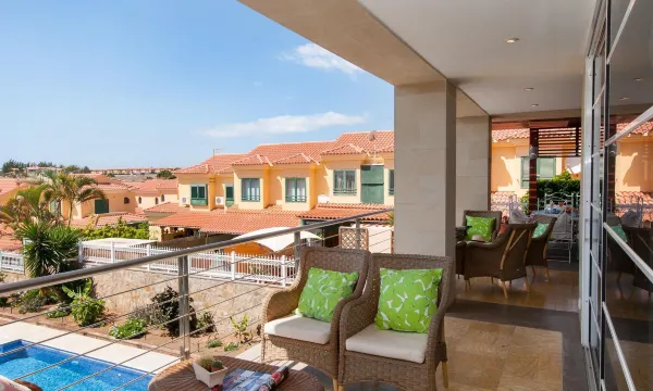 Large, comfortable single-family house. On the outskirts Maspalomas, in a quiet position. Private: garden (fenced) with lawn, swimming pool angular (11 x 5 m, depth 160 - 140 cm, seasonal availability: 01.Jan. - 31.Dec.). Outdoor shower, patio, garden furniture, barbecue. In the house: billiard table. Single garage, public parking on the road. Bus stop "Vistamar" 30 m. The owner does not accept any youth groups. Neighbourhood highly sensitive to noise. Quietness and good behaviour expected. "Sonnenland 12", 7-room house 634 m2 on 3 levels. Comfortable and modern furnishings: living/dining room with dining table, satellite TV and digital TV. Kitchen (oven, dishwasher, 4 ceramic glass hob hotplates, toaster, kettle, microwave, freezer, electric coffee machine) with dining table. Sep. WC. On the lower ground floor: 1 room with 2 beds and bath/WC. Exit to the terrace, to the swimming pool. 1 room with 2 beds and bath/WC. Living room with digital TV. Upper floor: 1 room with 1 french bed and shower/WC. 2 rooms, each room with 1 french bed and shower/bidet/WC. 1 room with 1 french bed and shower/WC. Patio. Terrace furniture, barbecue, deck chairs. Of the sea and the mountains. Facilities: washing machine, dryer, safe, iron, children's high chair, baby cot for up to 2 year olds, hair dryer. Internet (WiFi, free). Garage (1 car). Please note: non-smoking house. 2016/7671 // Reg. Nr.: ESFCTU0000350120001799270000000000000VV-35-1-00151704