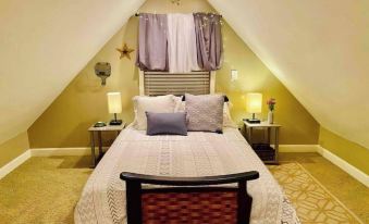A winding staircase leads to the loft area. Enjoy the picturesque views of the trees as you lie in the full-size bed large enough to accommodate two adults.