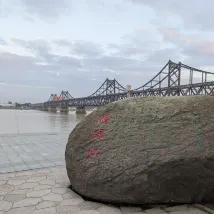 This hotel is located right behind the main shops you see when you walk along the river near the broken bridge. The view is just over the tile roof of the shops, and you can easily see North Korea, the main hotel in the opposite town, and the bridges. Views in the morning are not to be missed.