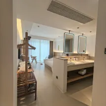 The room was fantastic and very smart, featuring electric curtains, speakers, and a double vanity. The food at the downstairs restaurant was also superb. The service was excellent too; they were very patient in explaining the surrounding area.