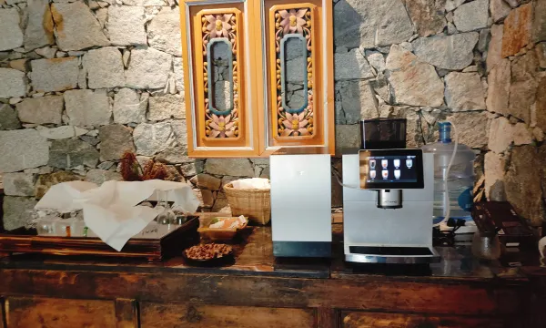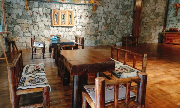 一傢俱有家庭式的温馨體驗,又有酒店形的標準服務和專業設施,設施簡單實用既有先進的文化融入又有傳統文化的沉浸,氛圍親切輕鬆。餐廳配置着咖啡機,石砌的牆面古樸厚重,搭配帶有精美雕刻的藏式木質裝飾框,營造出一種傳統藏文化與現代交融的休閑空間。房間內木質傢俱質感十足,我住的是温馨雙床房,雖沒有帶着陽台,但兩張床鋪乾淨整潔,還帶有傳統風格的長椅帶着小茶桌,牆面為温暖的黃色,整體是舒適的住宿空間,餐廳在下一樓,餐廳前帶着小院,旁邊還有主人家的客廳,大面積的木質神龕空間寬敞,既有傳統的生活器具,又有現代的電器,還有觀景窗,民宿老闆説這是公共活動區域,大家隨意哦!老闆一家的熱情讓這個民宿更加錦上添花,祝老闆生意興隆,財源滾滾