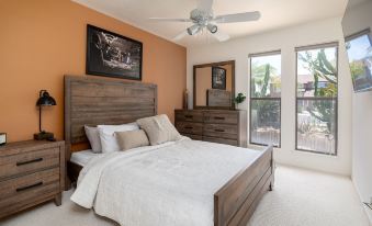 Nice house, nice view, nice location. Property manager was quick to reply when contacted. Listing inaccuracies:-No 2-to-4-person paddleboat. (Big disappointment.)-The two twin beds weren't the typical length. (My friends are both about 5'5" tall and barely fit.)- No rugs in the living room, though shown in the listing's photos. This made it quite echoey.The main reason I wouldn't rent this particular house again: Lack of privacy in the master bedroom. Its door is glass. And the open concept bathroom didn't have a separate door for the toilet. So the toilet and the bath tub/shower were in the same room as the bed. Not every couple would mind this, but I'm mentioning it because I did. Also, you had to remember to lower the shade on the big window before taking a shower or anyone on the deck by or in the hot tub would be able to see you.Nice enough place, but enough quirks and disappointments that I wouldn't book it again.