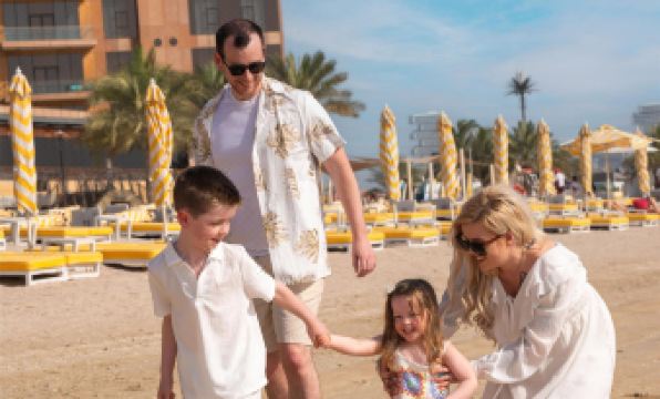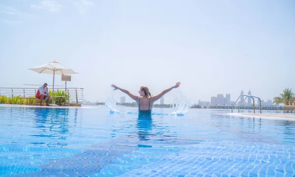 Guests can enjoy world-class leisure offerings, including an outdoor infinity pool with panoramic views of the Arabian Gulf, an adult-only rooftop pool, a 250-meter private beach, a modern fitness center, and a rejuvenating spa. Additional services include 24-hour front desk assistance, room service, currency exchange, and a daily international buffet breakfast.