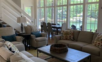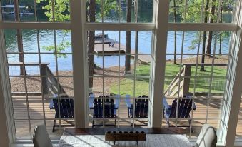 This 5-bedroom, 4.5-bathroom newly built Lake Martin residence provides plenty of relaxation and the perfect weekend spot to gather with family and loved ones! Featuring an array of household amenities and ample living space - both outside and inside - spread out and kick your feet up for an idyllic vacation at Alabama's most beautiful lake! This home offers a screened-in porch with large flat-screen TV (awesome for fall football!), along with two indoor seating areas that open to both a kitchen and dining area. The large, well-appointed kitchen boasts plenty of counter space for meal preparation and serving and comes stocked with stainless steel appliances, utensils, glassware and more. The dining area is situated in front of a full wall of floor-to-ceiling windows, offering an incomparable view of the water and sunset - the perfect complement to dinner. On the main level are two master suites, each with its own king-size bed and walk-in shower, as well as a separate powder bath and a laundry room.