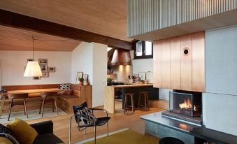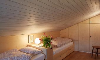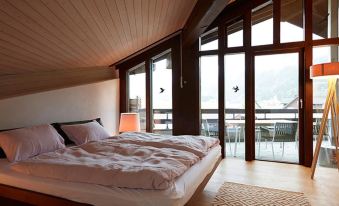 135 m2. More information by the provider: The very bright 4-room attic apartment (135 m2) was redesigned in a timeless, luxurious and elegant manner by the award-winning architect Özgür Keles (Biuld Inc.). The apartment is located on the 4th floor of house number 2 in the village settlement "Am Dürrbach", which is one of Engelberg's architectural and artistic attractions. The internationally known Sgrafittos of the Bündner artist Staivan Könz (who as a child was the model of the famous Schellenursli) and the very individual architecture of Albertus Magnus Caviezel make the settlement a very special place. Handcrafted fixtures, high-quality furniture and personal details create a cozy and at the same time light atmosphere in the flat. The large window front offers a spectacular view of the Engelberg Alps. The facility is located directly at the valley station of the Brunni Bahnen and about 10 minutes walk from the village center. The village settlement has an indoor swimming pool, fitness area, sauna and solarium. On two floors the apartment has, an entrance hall with cloakroom, a large living room with sofa, TV, Internet, dining area and fully equipped kitchen with dishwasher, Nespresso coffee maker and kettle. In addition, 2 bathrooms with shower / WC and bathtub. fireplace, 6 beds in 3 bedrooms, south-east-facing balcony (17 m2). 1 parking place is in the underground car park + parking spaces in front of the house. Ski storage. Washer and dryer in the house. Pets are not allowed. NON-SMOKING APARTMENT. Free WiFi. House / Residence - Ski lift 140 m