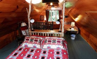 Downstairs bedroom with queen bed and upstairs bunkroom with queen and two singles will sleep two couples, or small family comfortably. Also perfect for one or two people who want privacy and peace. We do not cater to large groups - max adults is 5.