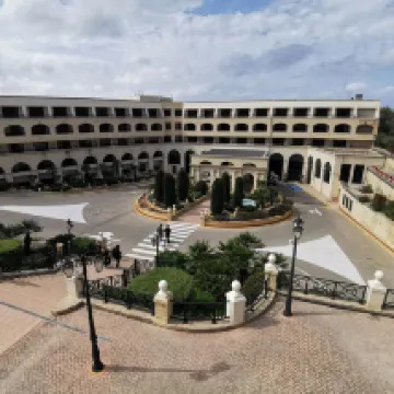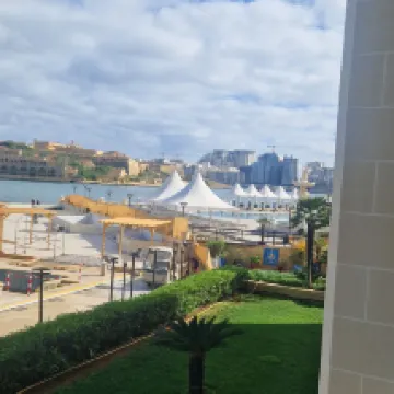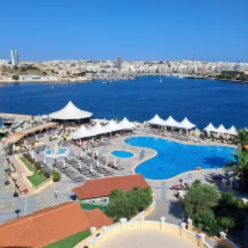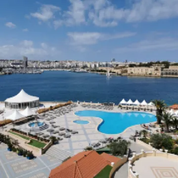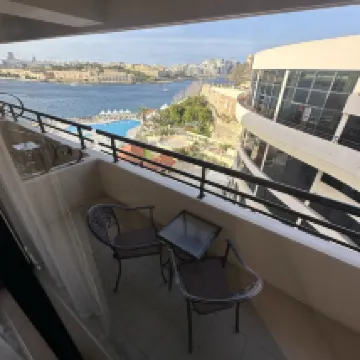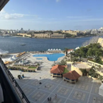 Lovely hotel, staff very good and friendly. Service at pool very good one day and very bad another day. Lovely to be able to swim in Med from man made beach...could make it more comfy under foot. Very close to valette entry bridge.... 5 min walk..