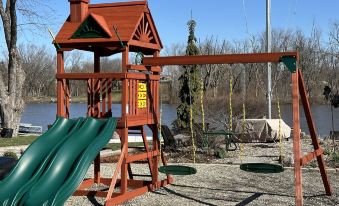 Sit on the sun porch with a cup of steaming hot coffee or tea and curl up with a book. Venture into the garage game room and play ping-pong, speed electronic basketball, air hockey, old school electronic bar top game, XBox One gaming system, dartboard, board games, and card games. Hang out in the Eagle's Nest Lodge above the garage, EVERYONE'S favorite place, where you can congregate around the bar, engage in conversation, listen to the jukebox, play games, watch TV, or go out on the balcony for the breezes, sights, and sounds of the Rock River as you search for eagles. Brand new wooden Gorilla playset for toddlers to 10-year-olds. Play outdoor games such as corn hole, ladder toss, fish off the pier or shoreline, sit around the fire pit making s’mores, and sipping your favorite beverage while watching the stars as they emerge from our breathtaking Wisconsin night sky.