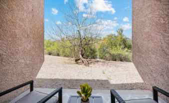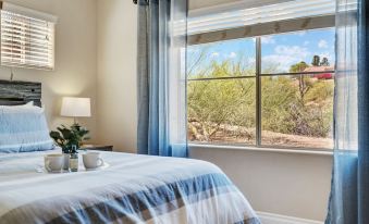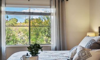 This property is a great option in Fountain Hills. The condo itself is well-appointed, comfortable, and clean. We had everything we needed, including a comfortable king-size bed with an overhead fan. The only downside (and it's only a downside if stairs are an issue) is the long interior flight of stairs from the front door down to the unit. Once you're in the unit, it's all on one level with a lovely, private view of the wash behind the complex. We enjoyed watching quail, roadrunners, and other birds every morning while having breakfast. The complex the unit is in is a great location with a grocery store, drug store, coffee shops, and deli within walking distance. We also walked to Fountain Park and the shops and restaurants on The Avenue of Fountains. We enjoyed the pool and the well-equipped gym right in the complex on multiple occasions without having to wait for a lounge chair or gym equipment. Even though the complex is situated on a fairly busy corner of Fountain Hills, the unit is super quiet.The hosts were quick to respond to questions and very welcoming. We had a great stay and will book this property again when we head back to Fountain Hills.