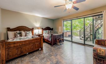 Inside, you’ll find two large living rooms, perfect for groups who want space to spread out. The main living area features vaulted ceilings, expansive windows, a smart TV, and a fireplace. Upstairs, the second living room invites quiet reading, games, or conversation, and includes a queen sleeper sofa for extra guests. High-speed Wi-Fi and cozy seating make it ideal for work or relaxation.