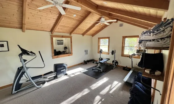 The wellness area is located 400 ft downhill from the main house and 500 ft uphill from the cottage. This area includes a 75 ft lap pool, 8 person jacuzzi, wood burning sauna imported from Finland, cabana with toilet, sink and shower (bathroom 4), outdoor seating for 14, a large gas grill and a 400 sq ft fully equipped gym with A/C and heating.