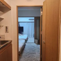 The room smelled strongly upon entering, but thankfully, it had floor-to-ceiling windows for ventilation. After opening them for a day, the smell was almost gone the next day. The wall coverings and carpeting looked worn and a bit stained, but the bed sheets and pillowcases were spotless. The bathroom was nice and clean, with a separate bathroom. The kitchen was a little grimy, but acceptable. Overall, the price was reasonable. Hotels in Fukuoka are generally a bit pricey these days, so this one was a good deal. It's definitely not worthy of four stars; I'd rate it three.
