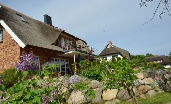 Semi-detached house. In the resort, 500 m from the sea, 2 km from the beach. For shared use: beautiful, well-kept garden. Barbecue, barbecue house. In the house: central heating system. Parking (limited number of spaces) at the house. Grocery 500 m, restaurant, bus stop 300 m, railway station 20 km, sandy beach 2 km, outdoor swimming pool 13 km, indoor swimming pool 13 km, swimming bay 2 km. Golf course (18 hole) 30 km, riding stable 5 km. The two reeded semi-detached houses including two apartments each are located in the first row facing the sea. All apartments offer direct views of the Baltic Sea, the small Gross Zicker harbour and the towns of Thissow and Klein Zicker situated opposite the bay. The holiday apartments have a high-quality and perfectly matching interior. Bicycles for hire. "Sonnenkliff", 4-room maisonette 86 m2 on 2 levels on 1st floor. Partly with sloping ceilings, comfortable and tasteful furnishings: living/dining room with Scandinavian wood stove, satellite TV, hi-fi system and DVD. Exit to the balcony, south facing position. 1 double bedroom with radio. Open kitchen (oven, dishwasher, microwave, freezer, electric coffee machine). Bath/bidet/WC. Top floor: 1 room with 1 double bed (160 cm, length 200 cm). 1 room with 1 double bed (160 cm, length 200 cm), satellite TV. Shower/WC. Balcony furniture. Facilities: washing machine, dryer, logs (free). Internet (WiFi, free). Parking (2 cars) at the house. Please note: non-smokers only. Maximum 1 pet/ dog allowed. Private entrance, smoke alarm. Two free parking spaces available. Additional parking spaces can be provided at a price of EUR 4.00 / day at a distance of 300 m, on request and after pre-order.