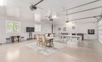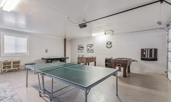 Game room features foosball, ping pong, pacman arcade game table and corn hole.