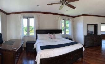 On the top floor: Master bedroom with bath and walk-in his and her closets, jacuzzi, shower and balcony overlooking the pool, 4 other spacious bedrooms and 2 other baths. All bedrooms are equipped with air conditioning and ceiling fans.