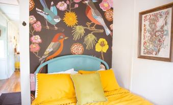 This classy little caboose makes you want to kick back with tea or a cocktail on the velvety couch to listen to an old record spinning. The bedroom is cozy and sweet, with a colorful nature themed mural behind the bed. Be sure to notice the caboose's authentic radio communication instructions on the wall too!