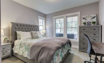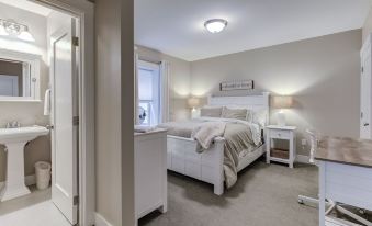 The second main suite boasts a comfortable queen bed and private bathroom with shower over tub.