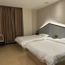 I booked this hotel for a business trip. The room is quite large. I saw the pictures online and it seemed pretty good and affordable. It's quite good. There is free mineral water in the room and a laundry room. The room I booked also has a desk, which is convenient for people like me on business trips. The cheaper rooms I booked before didn't have these facilities. It feels pretty good. I like the space, not crowded. Thumbs up. I will book this hotel again next time I go on a business trip. I hope it will be as cost-effective as before.
