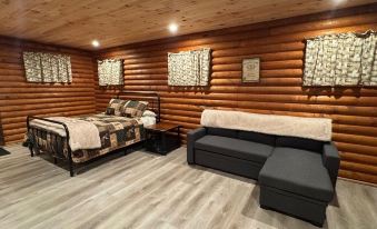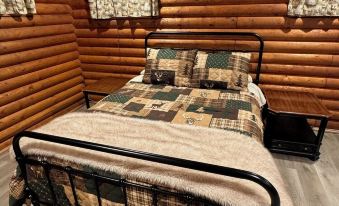 Escape to this charming wildlife themed cabin where you can see lots of wildlife. This enchanting retreat features a cozy open area log cabin with 1 queen bed and 1 sofa bed, perfect for unwinding after a day of exploring. With amenities like central heat and air conditioning, WiFi, and smart TV, you will feel right at home. Kitchenette area features an apartment size refrigerator with freezer, microwave, coffee pot and a nice round table with seating for 4. The bathroom is stocked with all the essentials you need. Covered front porch has a couch and a hanging swing with a huge firepit and free firewood just a few feet away!