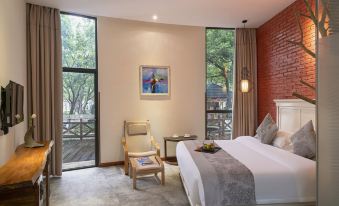 There is a century old famous building in the scenic area.After careful renovation, it shines with new brilliance. The hotel has three floors in total and cannot install elevators due to architectural layout issues. The hotel is named after the "Crescent Moon" personally nominated by the renowned scholar Mr. Guo Moruo. It retains the original historical appearance and has been carefully renovated into guest rooms with different styles. It is simple yet elegant, as the saying goes, leaving the hustle and bustle of the world and choosing to live in an art house. All french window in the room and the huge wooden terrace make you feel as if you live in the scenery.
